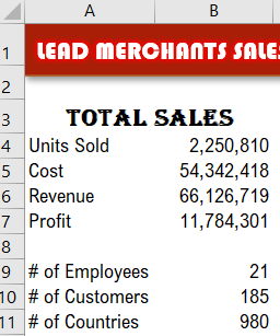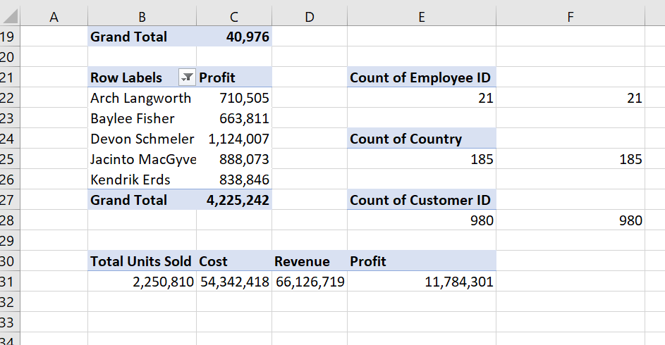 Unhide the Dashboard Tables sheet to see the added Pivots to replace these formulas. As you can see, we added a pivot table taking sums of Units Sold, Cost, Revenue and Profit. And we also added 3 pivot tables for counting the Employees, Customers and Countries.