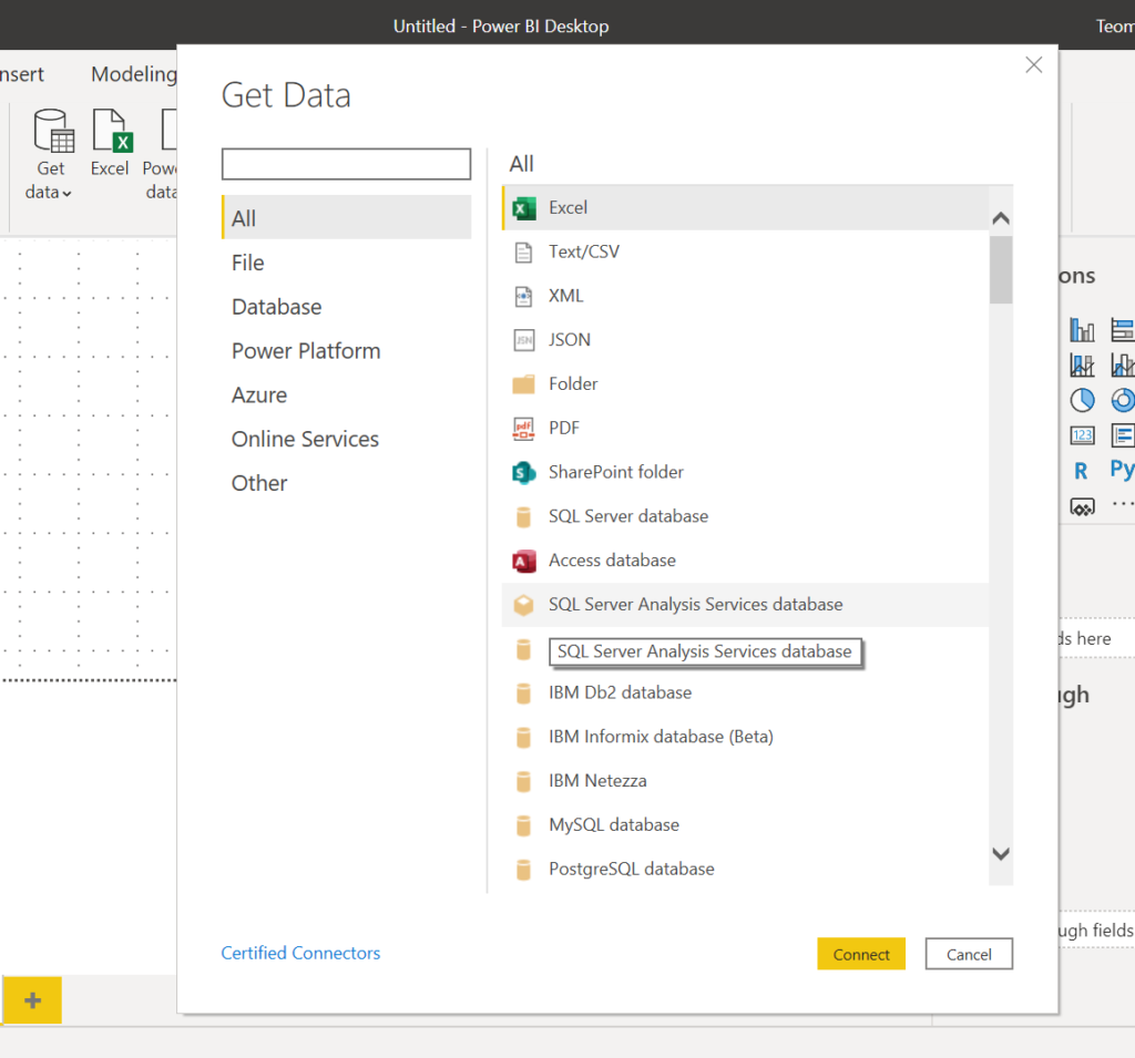 Press get data and get the data dialogue box opens. Here you can see there is a very long list of data/container types you can load to Power BI. Scroll down the list to see the list. An important feature of PBI is you can load data from different resources and add different types of data to your data model.