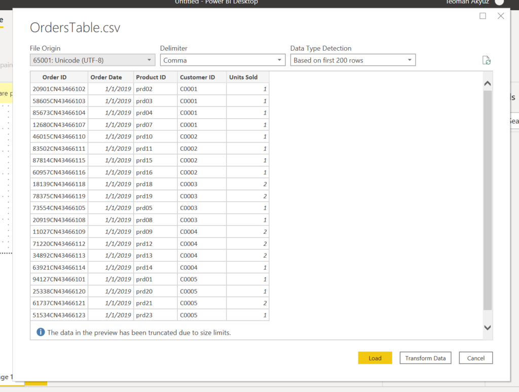 Press load, orders table will be loaded to PBI, and you will land in PBI Report view.