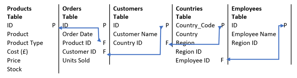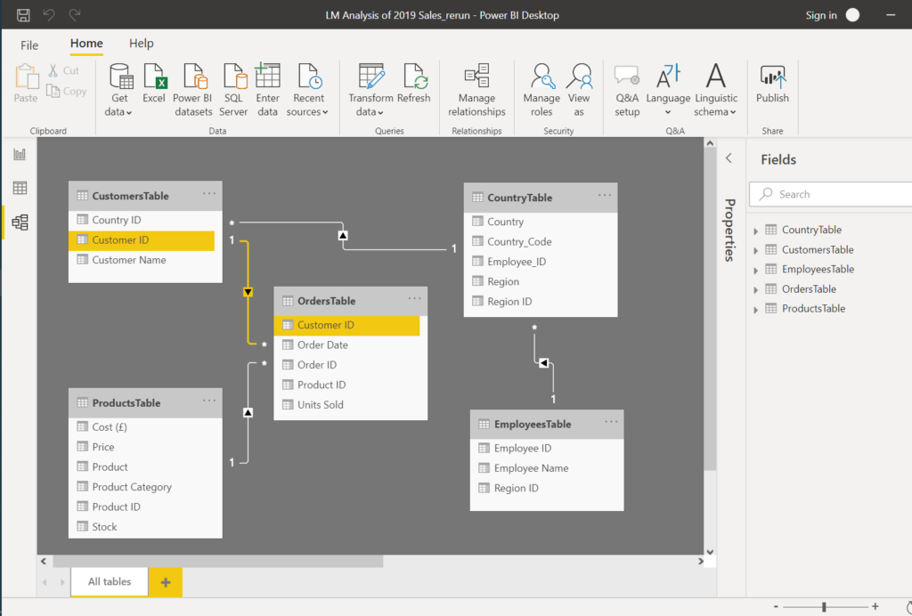 Click any line of an established relationship to check which fields are used for connections, and use the table below to set up the data model with connecting Primary Keys to Foreign Keys.