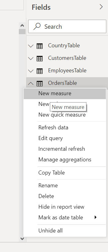 On the fields pane right-click on the OrdersTable title, you can see the operations you can do over the tables. Select New Measure from the drop-down list (or press the New Measure button on the Table Tools ribbon).
