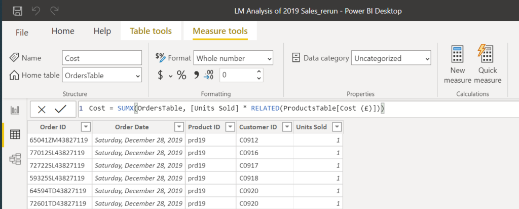 Cost = SUMX(OrdersTable, [Units Sold] * RELATED(ProductsTable[Cost (£)]))