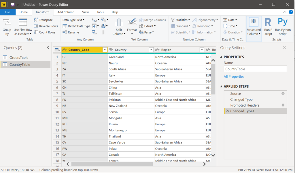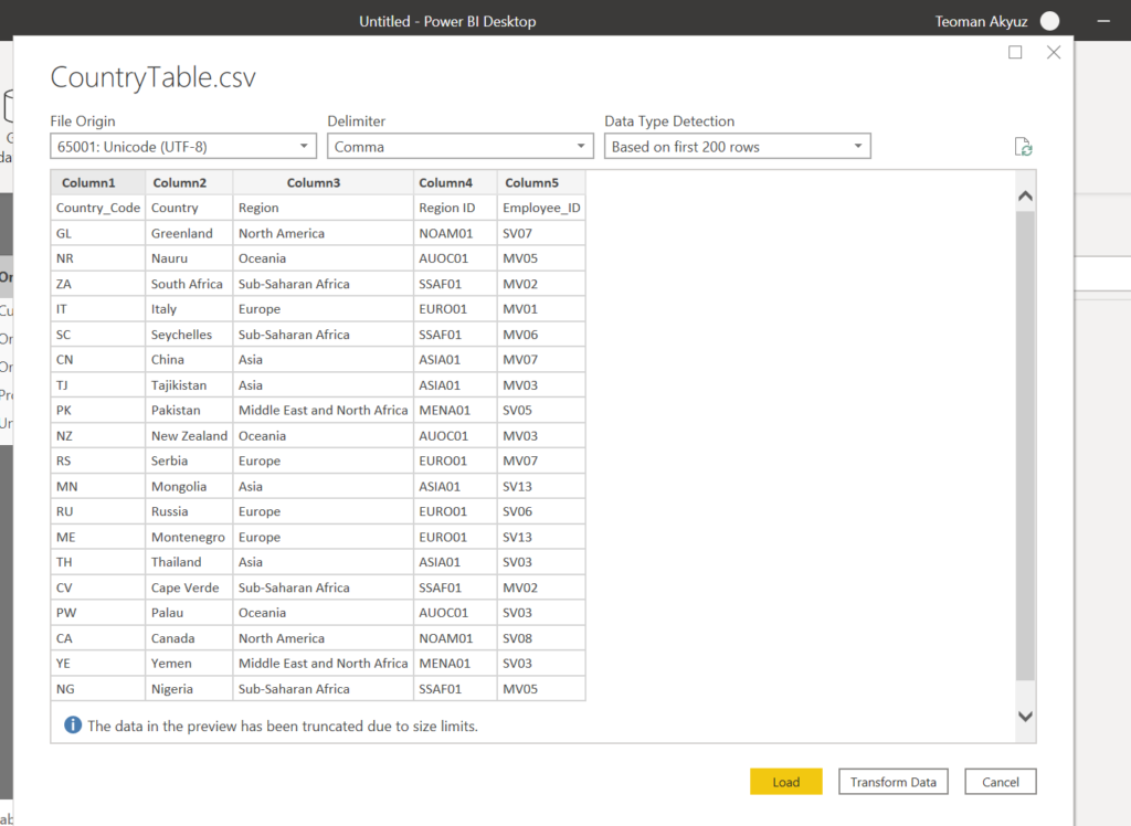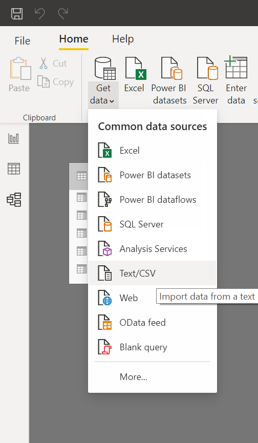 Under the Home, menu select the Get Data tab and select Text/CSV to load the country table.