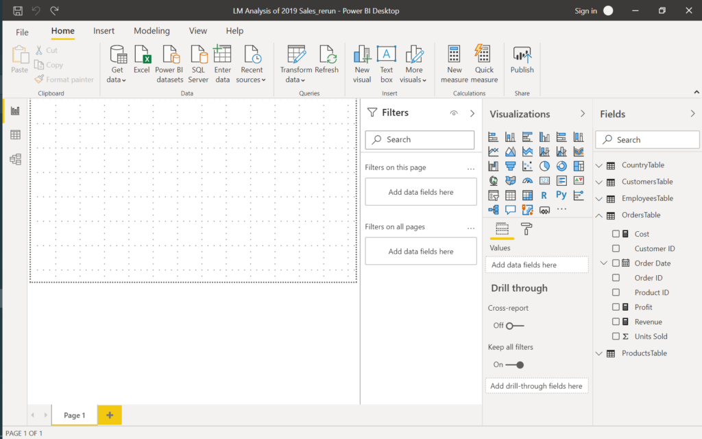 After finalising all the tables make sure to resize the tables and set them on the report for best viewing, rename Page 1 (at the bottom) as ‘Sales Report’.