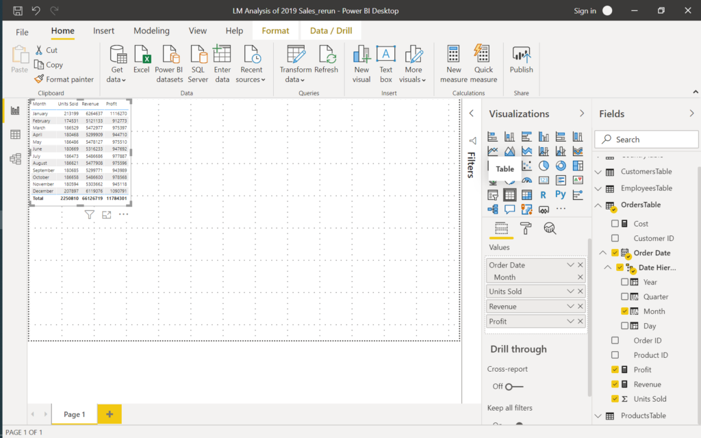 Add Table, and a blank Table will be added to the report, then choose Month, Units Sold, Revenue and Profit fields from the orders table.