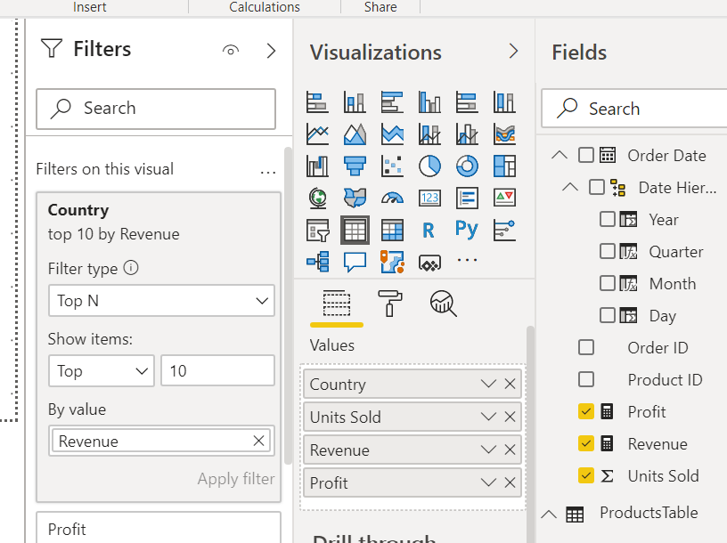 Now expand the Filters Pane, expand the Country Filter, select Filter Type ‘Top N’, in Show Items select ‘Top’ and write 10, drag & drop Revenu column into By value field. Press Apply filter.