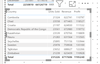 Add another Table visual, select Region field from the country table, Units Sold, Revenue and Profit fields from the orders table.