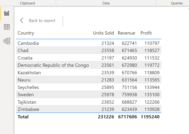 Add a Table, select Country field from the country table, Units Sold, Revenue and Profit fields from the orders table.