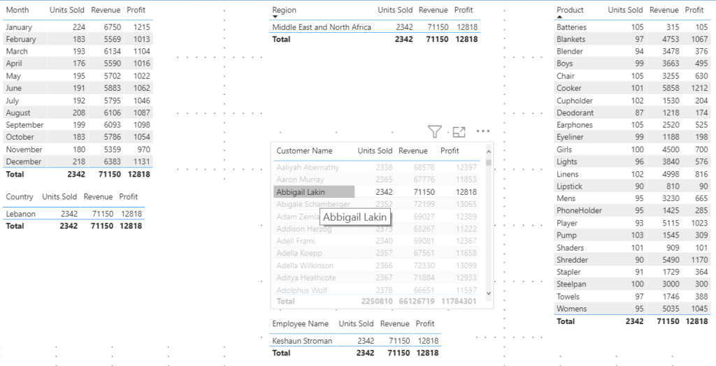 Add another Table visual, select the Customer Name field from the Customers table, Units Sold, Revenue and Profit fields from the orders table.
