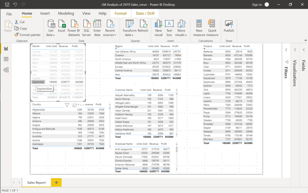 Remove the filters from Country, Customers and Employees tables and collapse all tabs on the left for best viewing. Click on September at the Months table: All the tables in the report now show September 2019 results.