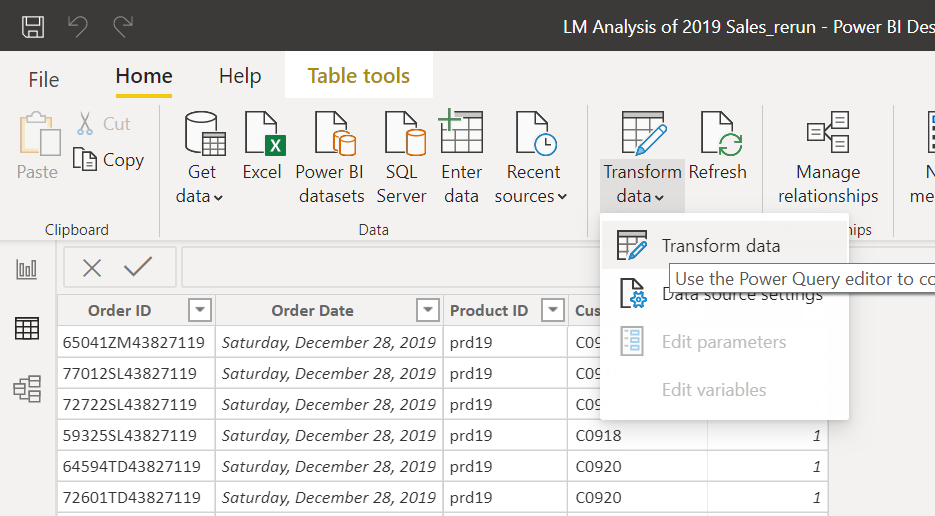Right-click on the Order ID column and select Remove from the drop-down list.