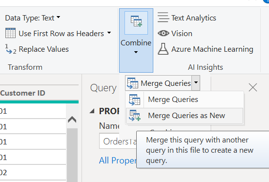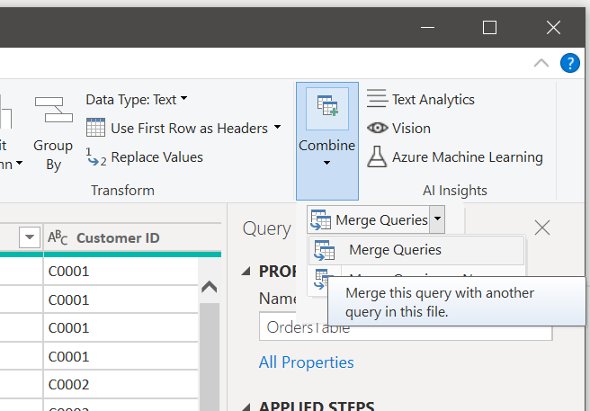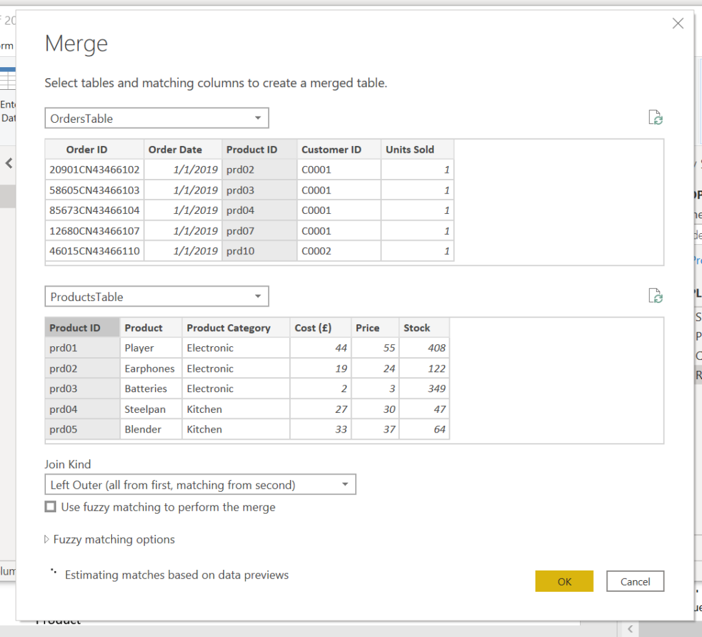 In the Merge dialogue Select Orders Table and Products Table, select Product ID columns for the link between these 2 tables and press OK.