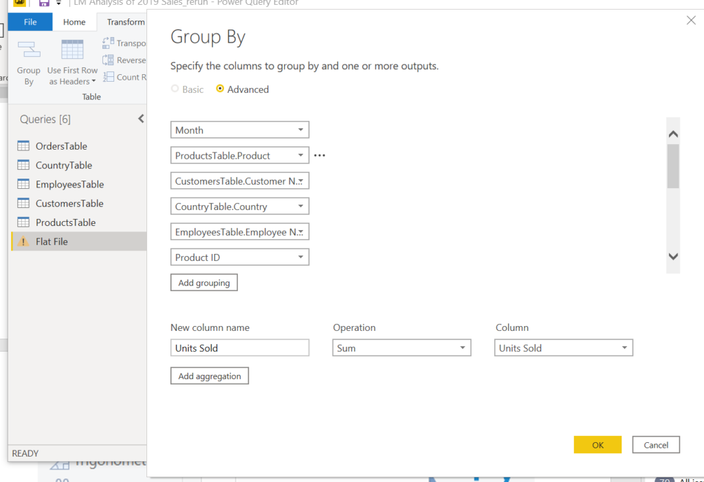 Click Advanced, add all columns for grouping except Units Sold, Price and Cost columns. We will aggregate the Units Sold column and add calculated columns for revenue and cost.