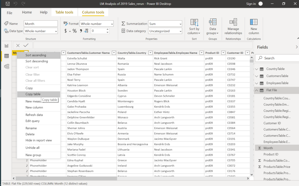 Press the Close & Apply button under the Home menu, we land in the PBI window. We have a flat-file of 229.560 rows and one header row.