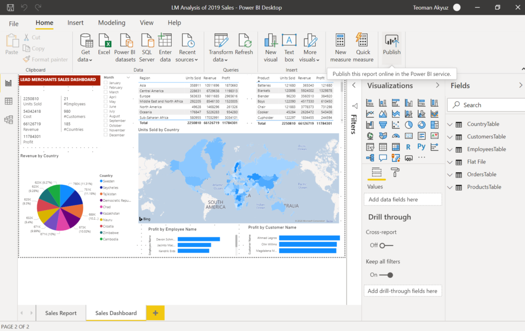 And select the LM Analysis of 2019 Sales report to examine the reports we have prepared in PBI Desktop. You can see the 2 pages we have prepared on the desktop. Select the Sales Dashboard from the page tabs at the bottom.