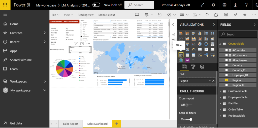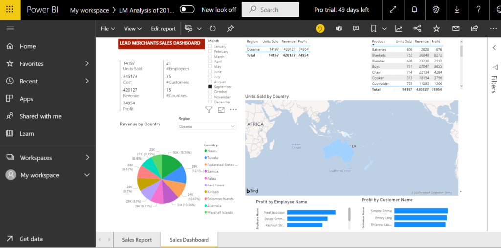 Save the report at this final state, File > Save as, Name as ‘PBS – 2019 Sales’. You will see the report we just saved under My workspace > Reports.