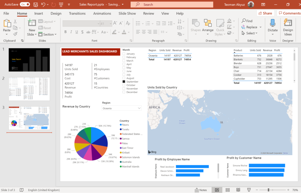 Below, the Sales Dashboard report showing September 2019 results for the Oceania region.