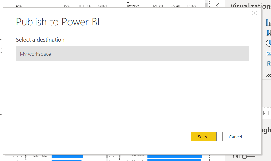 In the Publish to Power BI dialogue select My workspace.