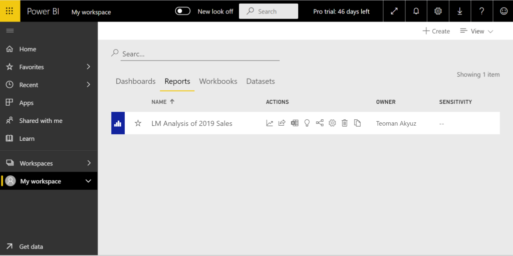 Power BI Service will open in a browser window, from the menu on the left select My workspace. This is where we just loaded our reports.